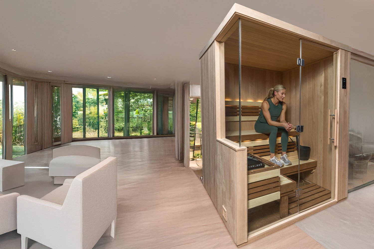 An all-glass front provides a beautiful view in and out of the sauna, and the unique bench configuration is great for both social and independent saunas.